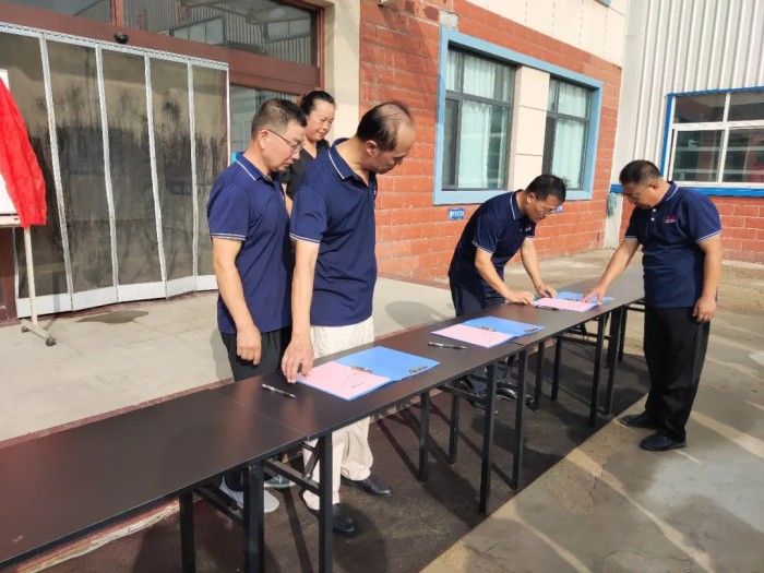 大会第三项,技术部王总监、销售部姜经理、制造部于经理签署军令状,他们将责任扛在肩上,以实际行动为茂源的发展全力以赴。签完后,三位领导将军令状置于胸前,留下了庄重的一刻。